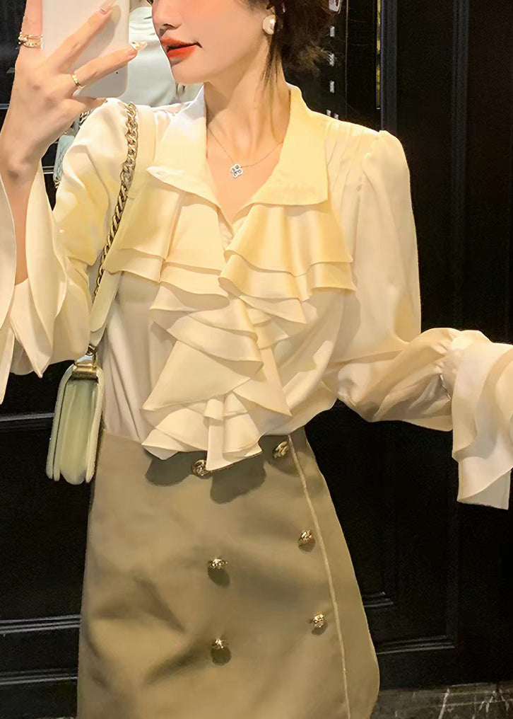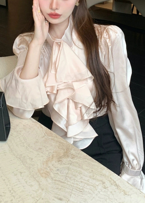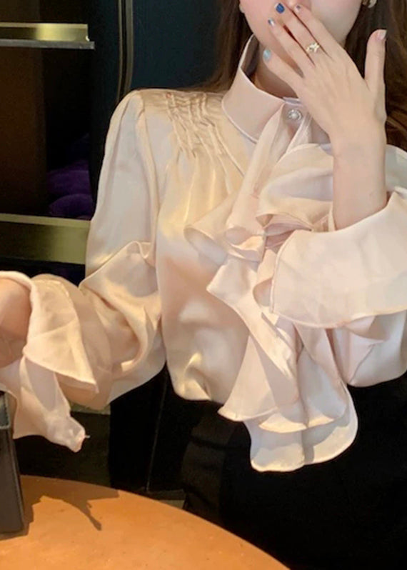 Stylish Apricot Peter Pan Collar Ruffled Chiffon Shirts Spring